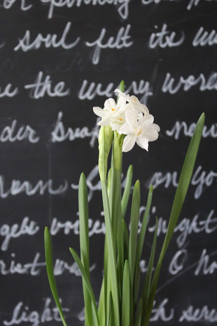 Another tradition in our home is one that not all of us agree on. The forcing of paper white bulbs. The scent to me says Christmas, but to some other occupants of our home, it says something else. Not everyone in our house is a fan of the smell of paper white blooms, but they sure are pretty in front of the my DIY chalkboard art. You may remember a few years ago I hand wrote the lyrics to O' Holy Night on an old mirror that I painted with chalkboard paint.