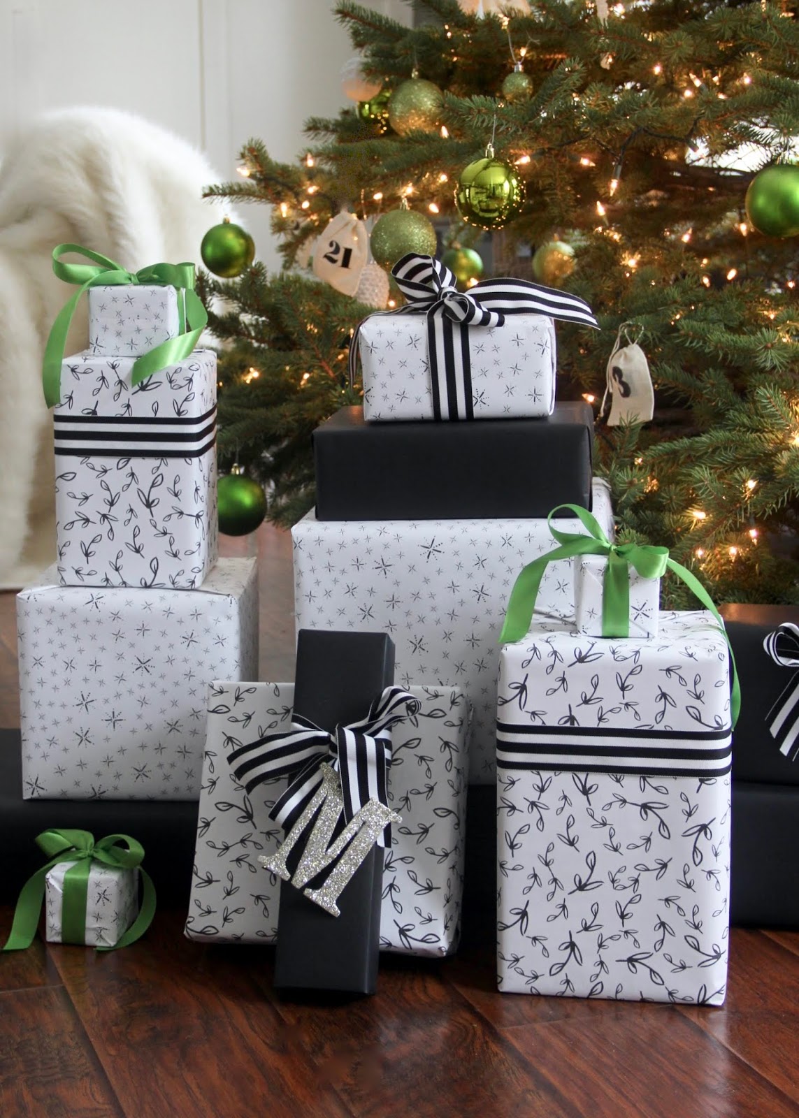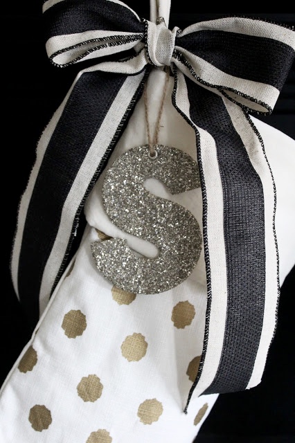 A few years ago, I picked up these fun gold and white polka dot stockings on clearance from Potterybarn. To give them a custom look, I added a black and white bow and a German Glitter monogram ornament to each one.