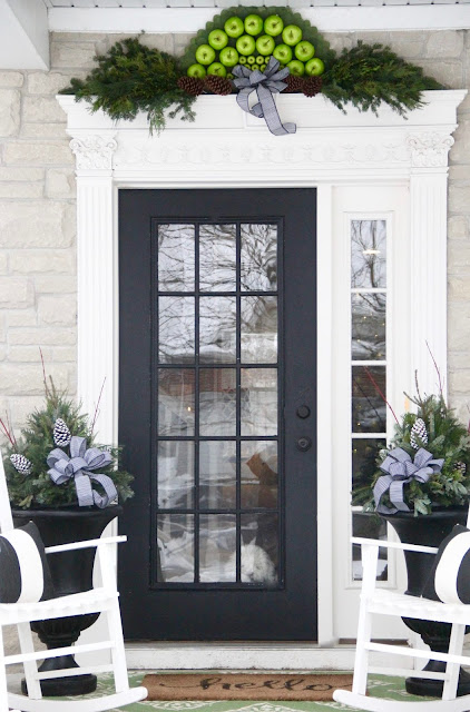Every year, I start our Christmas decorating on the front porch. One of the things that drew me to this home when we originally bought it was the trim around the front door. I decided to highlight that this year with a simple, but festive fruit and evergreen arrangement. When I was little, my mom used to decorate over our door using oranges, nutmeg, red apples and pineapple. I put a spin on my moms project and went with a simple, monochromatic look. I chose green apples, pine cones, eucalyptus and evergreens.