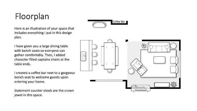 Yesterday, I shared a living room design plan for an online design client who just purchased a brand new vacation home. Today, I'm sharing the plan I created for the dining room and kitchen. The home will be used by the owners mainly, but someday may be used as a VRBO destination for travelers. The design I created for this space gives the home a ton of style, while maintaining a practical, durable and functional approach. This living room design is soothing, warm, comfortable and inviting... it will definitely be hard to leave when the the weekend is over...
